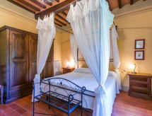 Borgo Stoppi, situated at 600 m a.s.l. at the foot of the Castello Poggio alla Regina, was a property of the counts Guidi since the 11th Century and after some changes of owners, in the 14th Century it became the main centre of the medieval district named Curia del Castiglione and agricultural capital of the surrounding mountain area, with its own town hall and big weekly market. Today, the old houses of the hamlet have been restored to 8 units, enhancing in a superb manner the beauty this affascinating place has maintained during the centuries: cypress, oak, pine and chestnuts trees are silent testimonies of Nature and wild boars, hares, squirrels, phaesants and owls may be watched in the surroundings. From the terrace covered with olive trees that produce one of the best and genuine olive oils of the area, you can enjoy a magnificent panorama over the Arno valley and the Chianti hills. Residence Borgo Stoppi, 600 m a.s.l.. 2.5 km from the centre of Reggello, 30 km from the centre of Firenze, 35 km from the centre of Arezzo, in a quiet, sunny, elevated position, 70 km from the lake, in a cul-de-sac, in the countryside. For shared use: property 5'000 m2, swimming pool (6 x 12 m, depth 150 cm, seasonal availability: 22.May. - 08.Oct. pool opening hours: 08:00-21:00). Outdoor shower. Heating to be paid on the spot, heating available only from 01.Nov. - 07.Apr.. Steep motor access to the house (800 m via unmade road). Parking on the premises. Shop 2.5 km, grocery 2.5 km, supermarket 2.5 km, restaurant 2.5 km, bar 2.5 km, café 2.5 km, bus stop 3.5 km, railway station Figline Valdarno 10 km, bathing lake Lago di Bilancino 70 km. Nearby attractions: Firenze 40 km, Siena 86 km, Arezzo 64 km, Abazzia di Vallombrosa 16 km. Please note: car recommended. Suitable for families. The photograph shows a typical example.